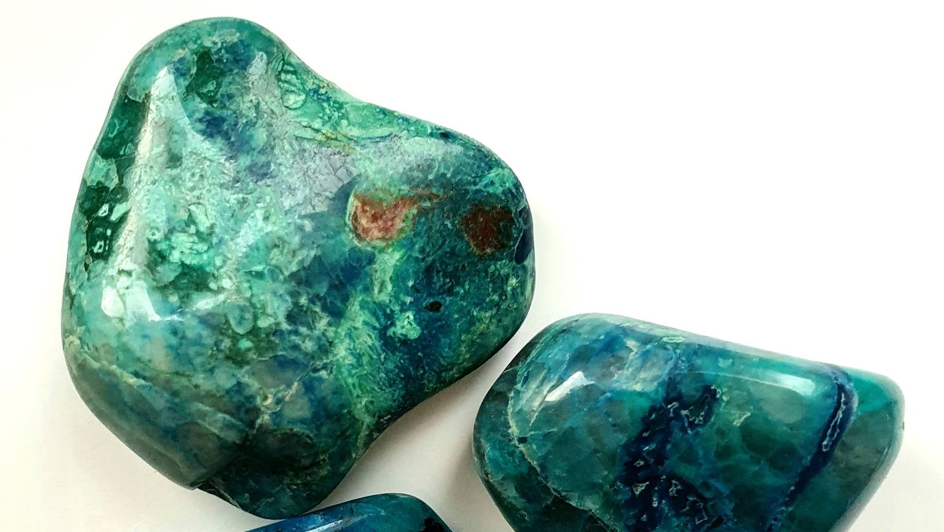 Chrysokoll, auch ein kupferhaltiges Mineral, bringt die Gefühle ins Gleichgewicht und vermittelt zwischen Verstand und Herz, wobei das Herz mehr angesprochen wird.
